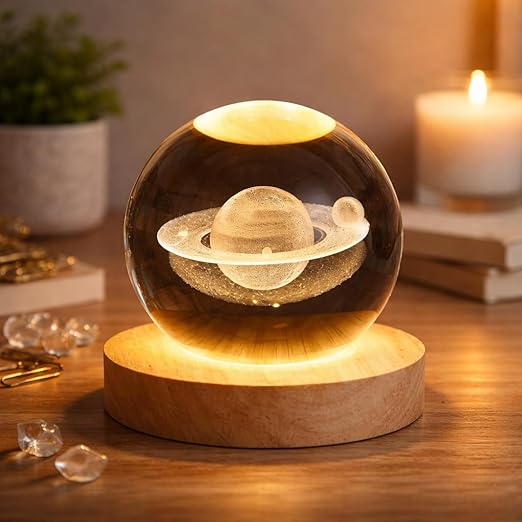 3D Saturn Crystal Globe Lamp | Engraved Crystal Ball LED Night Light with Wooden Base | USB Powered Table Lamp for Bedroom, Living Room, Office, Study & Home Decoration | Unique Gifts Item Size- 7*9*10 Weight- 600g